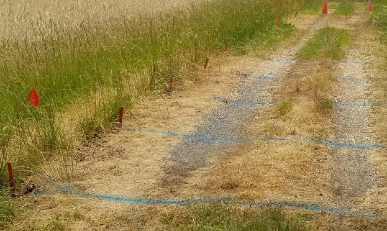 An experimental field trial was conducted in 2022 at the Central Maryland Research and Education Center, Beltsville facility, to evaluate the efficacy of an experimental herbicide (DDI) for immediate burndown and residual weed control. Treatment plots were established along a 200 m farm lane with a mixture of weeds growing between the wheel tracks on a gravel+soil substrate and compared directly next to the lane with weeds growing on a soil substrate (Fig. 1). Four replicate blocks of plots were laid out along the farm lane at selected sites with similar sunlight exposure and weed composition. Each block consisted of five plots in the gravel+soil substrate, paired directly with five plots on one side of the lane in the soil substrate (Fig. 2). Each plot measured 1 m x 2 m.