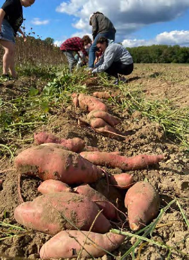 While some students in the course grew up riding tractors and harvesting crops, for many the field trip is their first time ever setting foot on a farm. Not only do they tour the facility and learn about how both agronomic and horticultural crops are grown, they get to take part in the process themselves. In 2022, students harvested sweet potatoes destined to be served in campus dining halls – and eaten by their peers.