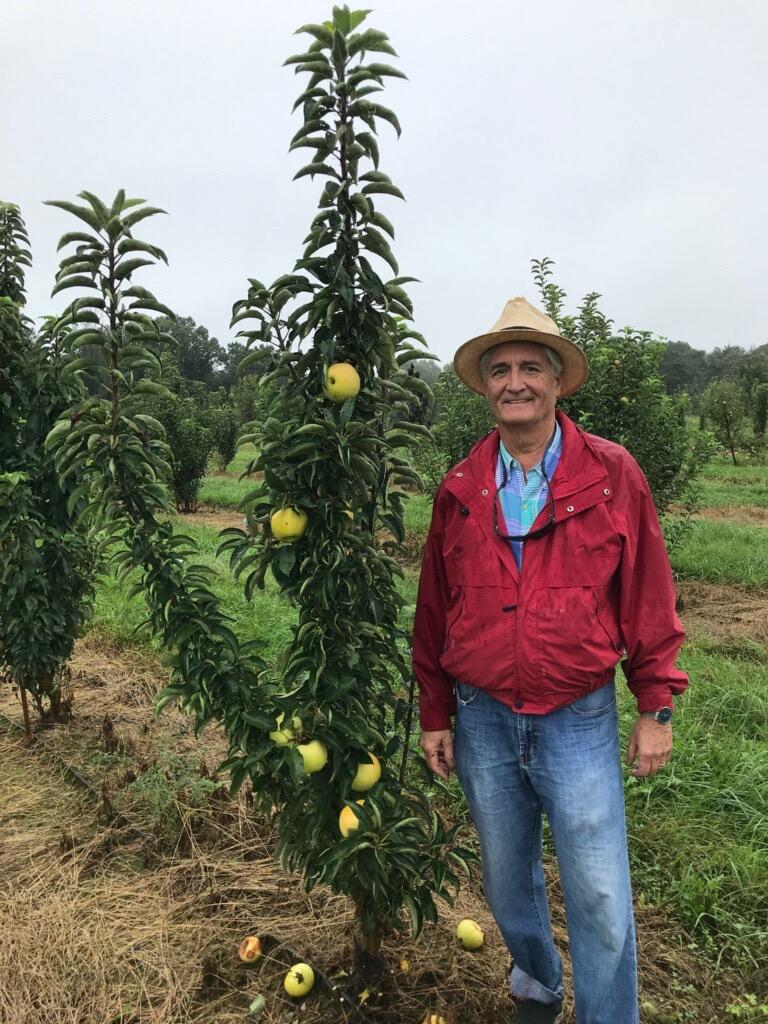 Professor Emeritus Christopher Walsh stands beside one of the new Maryland apple trees.