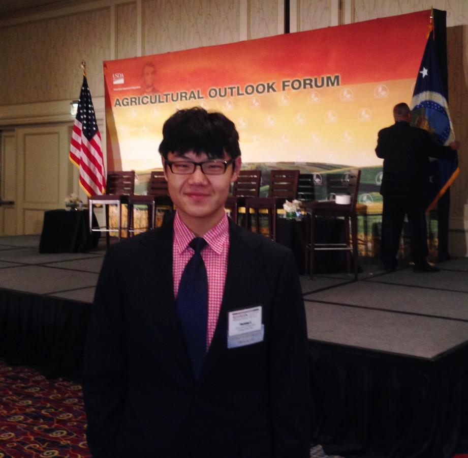 Pinzhang Li, a senior in the Department of Agricultural and Resource Economics, was one of 20 undergraduate students from universities across the country selected to attend the 2014 Agricultural Outlook Forum hosted by the U.S. Department of Agriculture. The event was held in Arlington, Va. and took place February 20th and 21st.