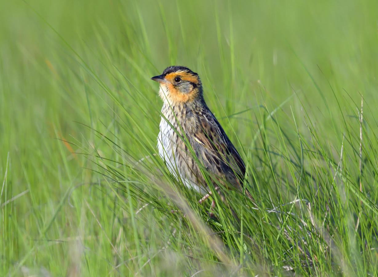 A saltmarsh sparrow in its crucial nesting habitat of marsh hay cordgrass. Saltmarsh sparrows nest only in tidal marshes of the northeastern US, and their populations are declining rapidly due to habitat loss.
