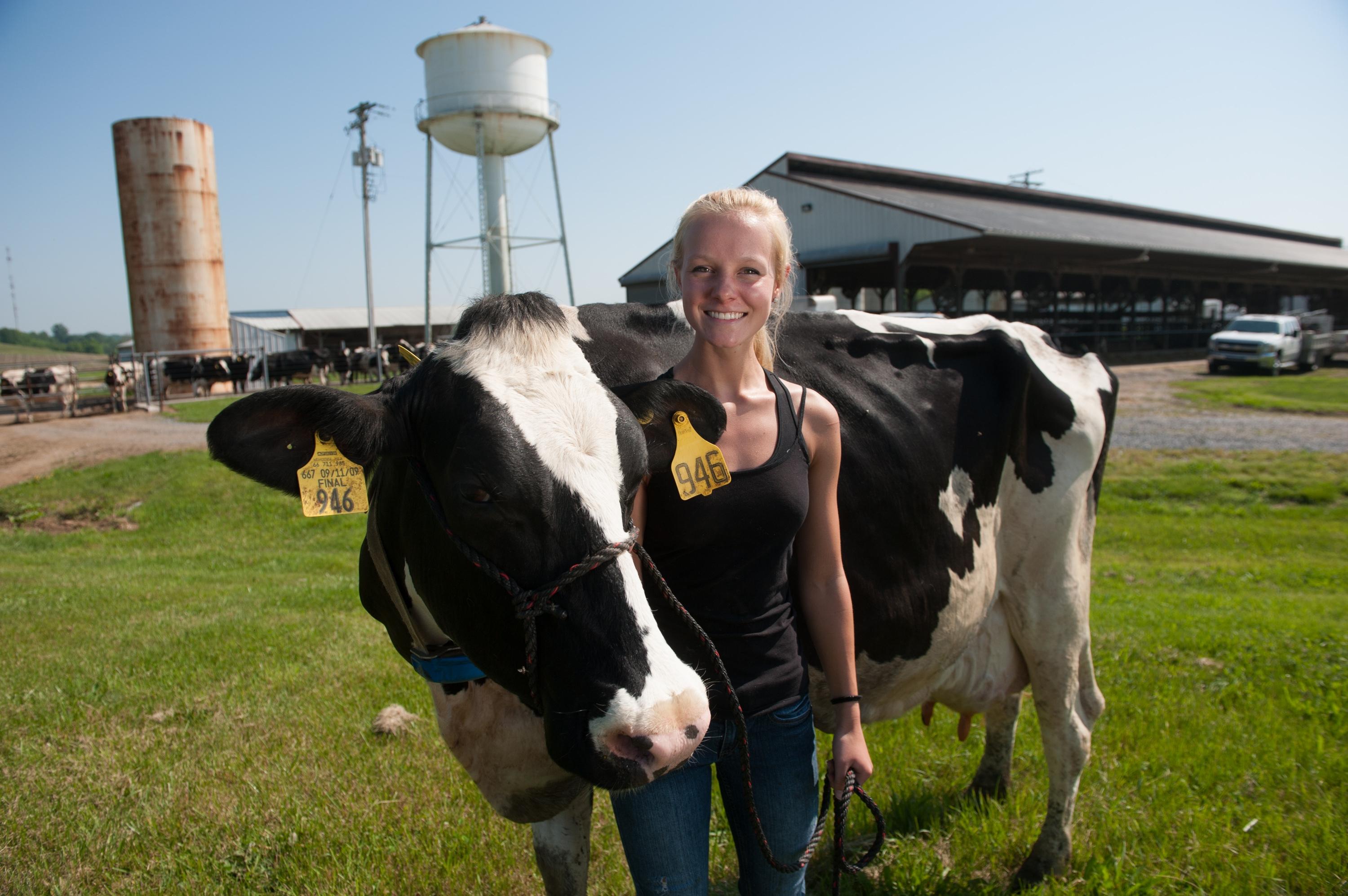 Melissa Shaughness, a sophomore animal science major, poses at UMD's dairy farm in Clarksville.