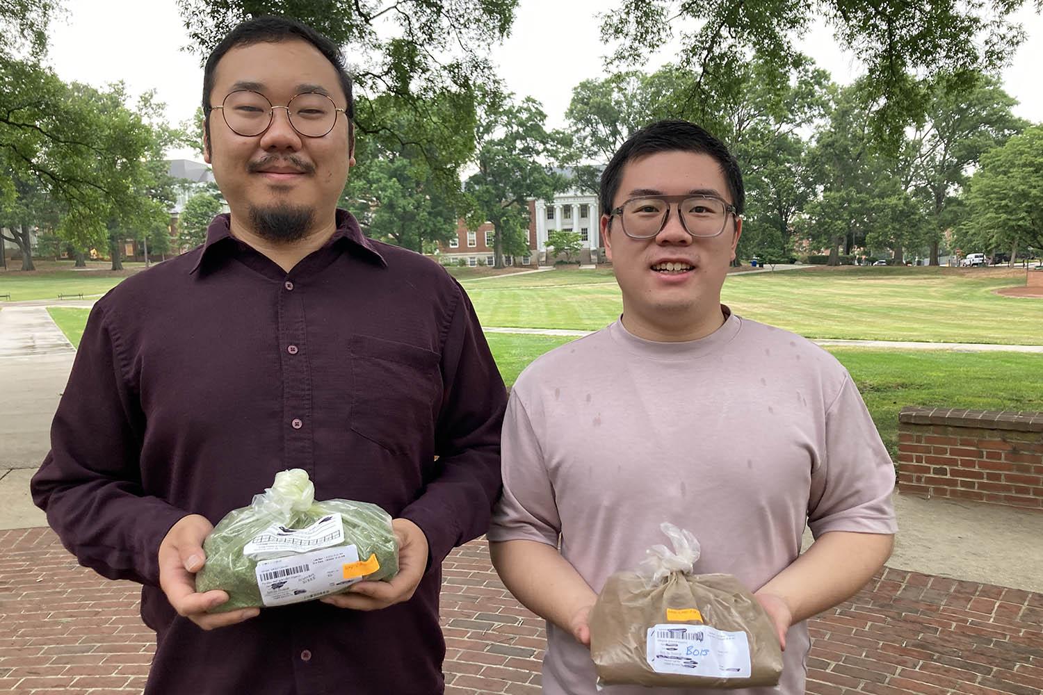 Ethan Young-Hyun Lee (left) and Fangxiang Dong holding the herbs they are investigating for their antiviral properties.
