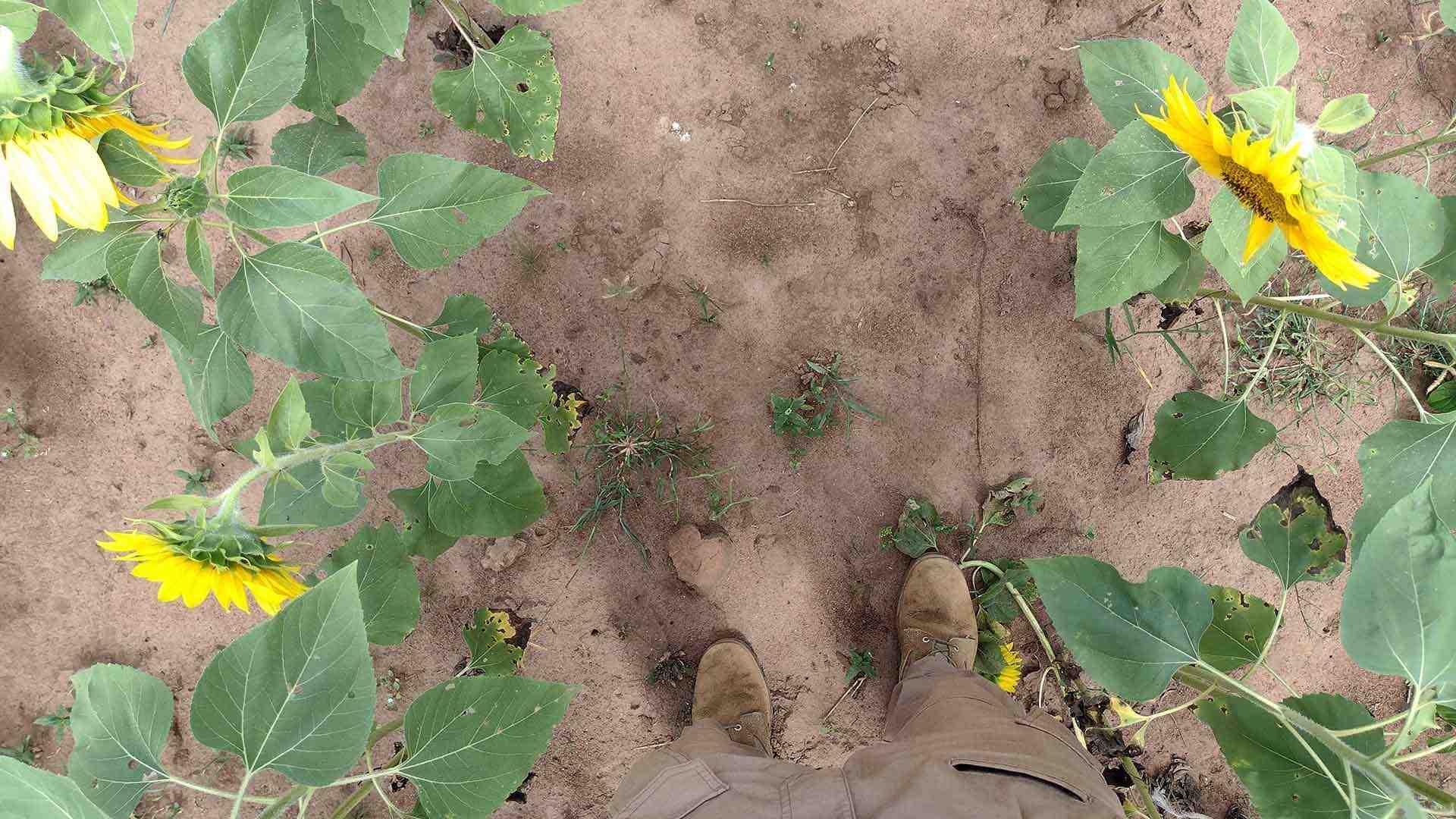 Crop plants were spread too widely for their size in some fields, leaving bare soil to be dried and scorched by sunlight. Weil recommended increasing crop density by growing plants like this sunflower closer together so the sunlight hits plants rather than the ground.