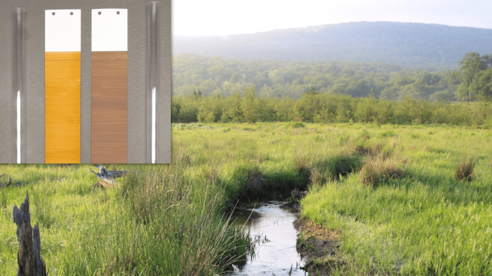 The technology of using oxide coatings on plastic is called IRIS (indicator of reduction in soils), and the current method applies an iron-oxide paint to PVC pipes that are pushed into the soil and left for a month so the soil can react with the paint. As these reactions occur, the paint is partially dissolved from the tube. If 30 percent or more of the paint is stripped off, the soil is behaving like typical wetland soil. This method, however, is problematic for many reasons. “Some of the paint can rub off the tube as it is transported and when it is pushed into the ground, so that is one source of error,” says Rabenhorst. “The tube is also a 3D cylinder, which makes it difficult to accurately estimate the amount of paint that has actually been removed. You want to be able to scan the surface for analysis, but scanning a 3D tube requires specialized custom-made equipment, so that is a problem.” The current tube system also produces a lot of plastic waste. “I have used 5,000 PVC tubes over the last 10 years or so, and they can’t be reused. It’s a real problem, and it doesn’t feel very ‘green’,” says Rabenhorst.
