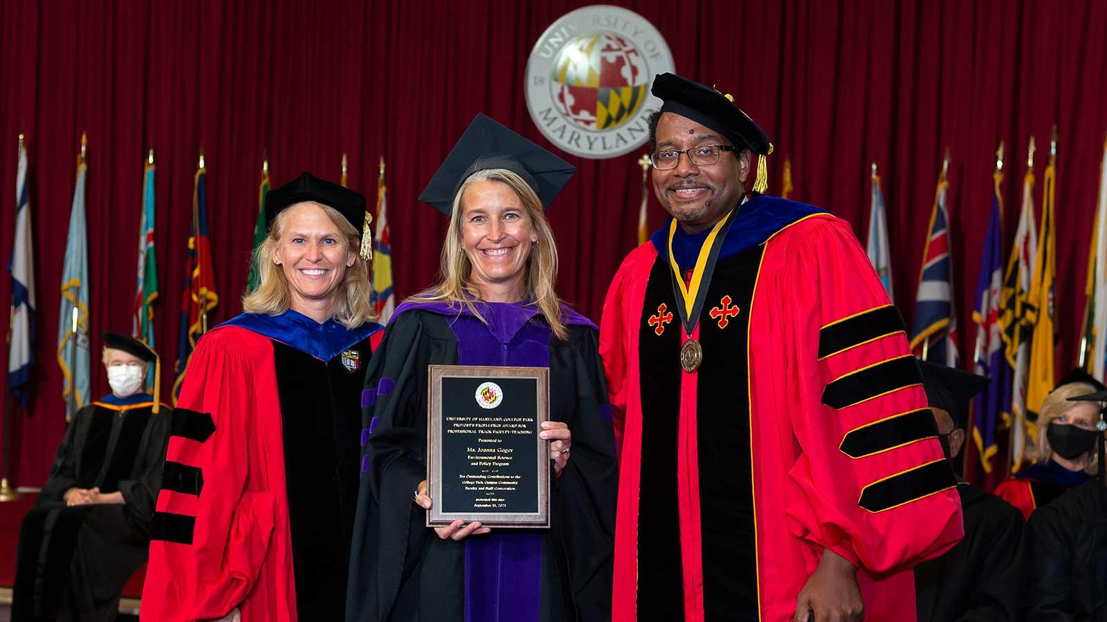 The University of Maryland (UMD) held its 38th annual Faculty and Staff Convocation on Wednesday, September 15 at the Memorial Chapel to recognize 26 members of the UMD community for their service and contributions. Among those celebrated was Joanna Goger, senior lecturer with the Environmental Science and Policy Program (ENSP), who was awarded the Provost’s Excellence Award for Professional Track Faculty (PTK) in Teaching.