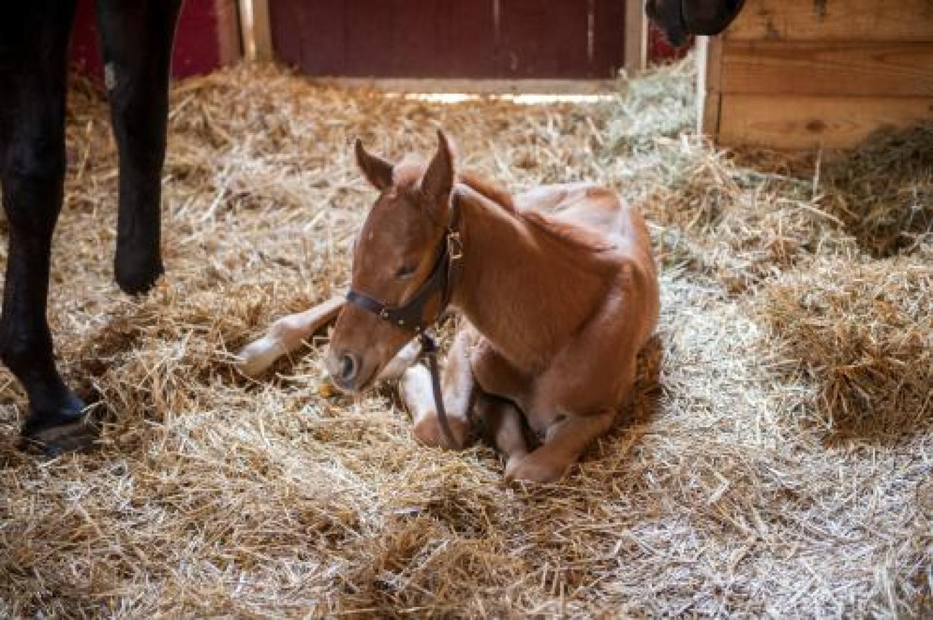 The second foal (pictured right) was born on the morning of March 29th, which was a week earlier than expected. He is a chestnut colt thoroughbred and was born by his father, Friesan Fire and his mother, Daylight Lassie.