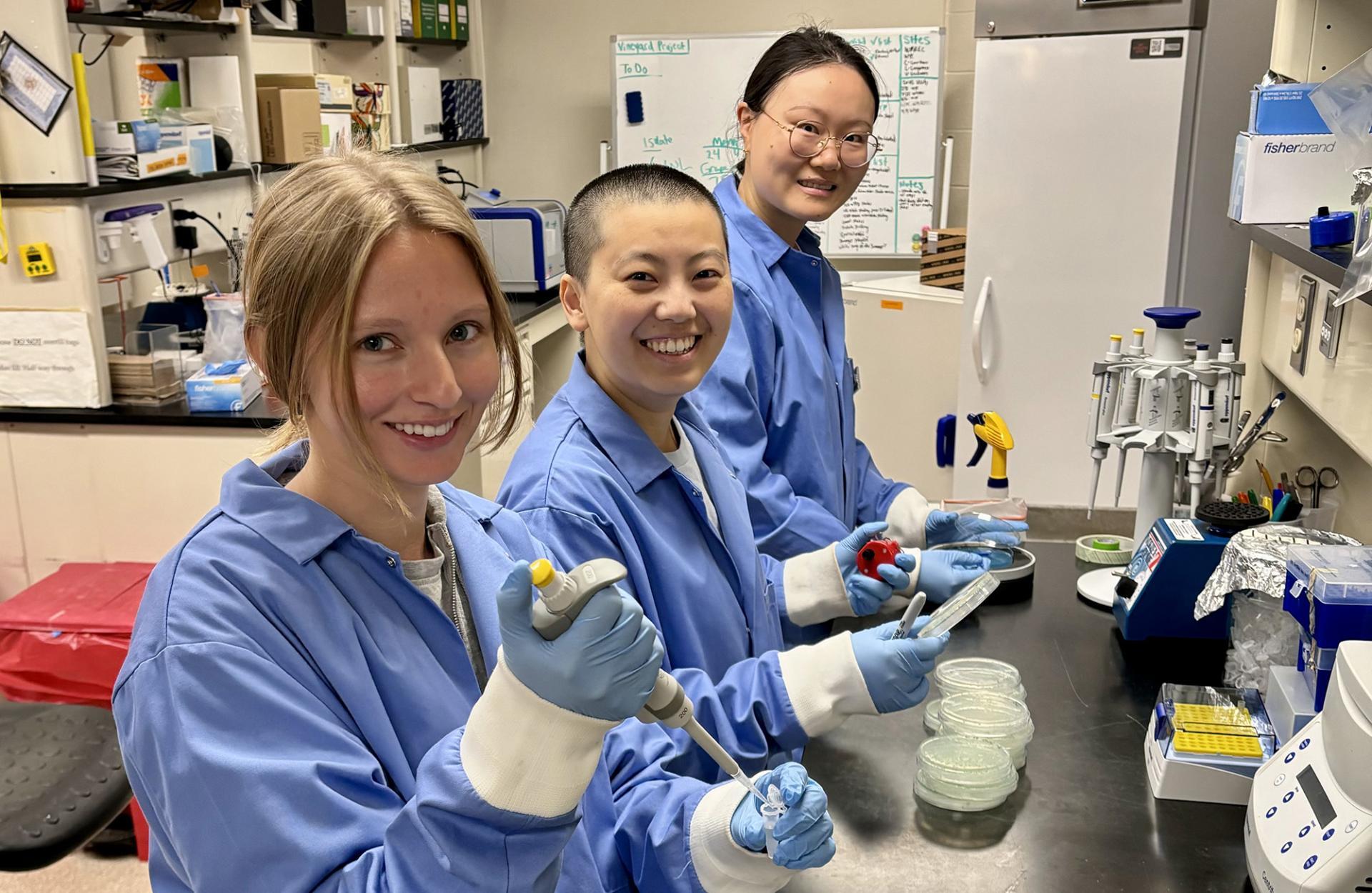 Part of the antimicrobial resistance research team from left to right PhD students Erin Harrelson and Qingyue Zeng and postdoctoral associate Dr. Mairui Gao