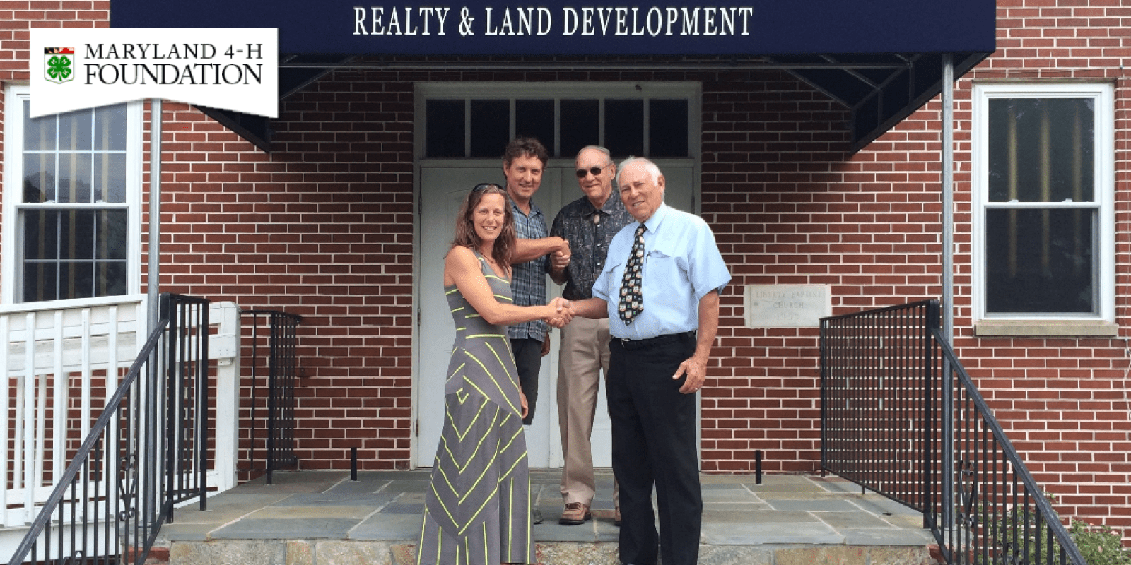 David Liker (top left) and Lydia Liker (bottom left) shake hands with MD 4-H Foundation President & Chair Charlie Iager (top right) and foundation treasurer Grant Hill after purchasing farmland bequeathed to the foundation by the late Lansdale Pue.