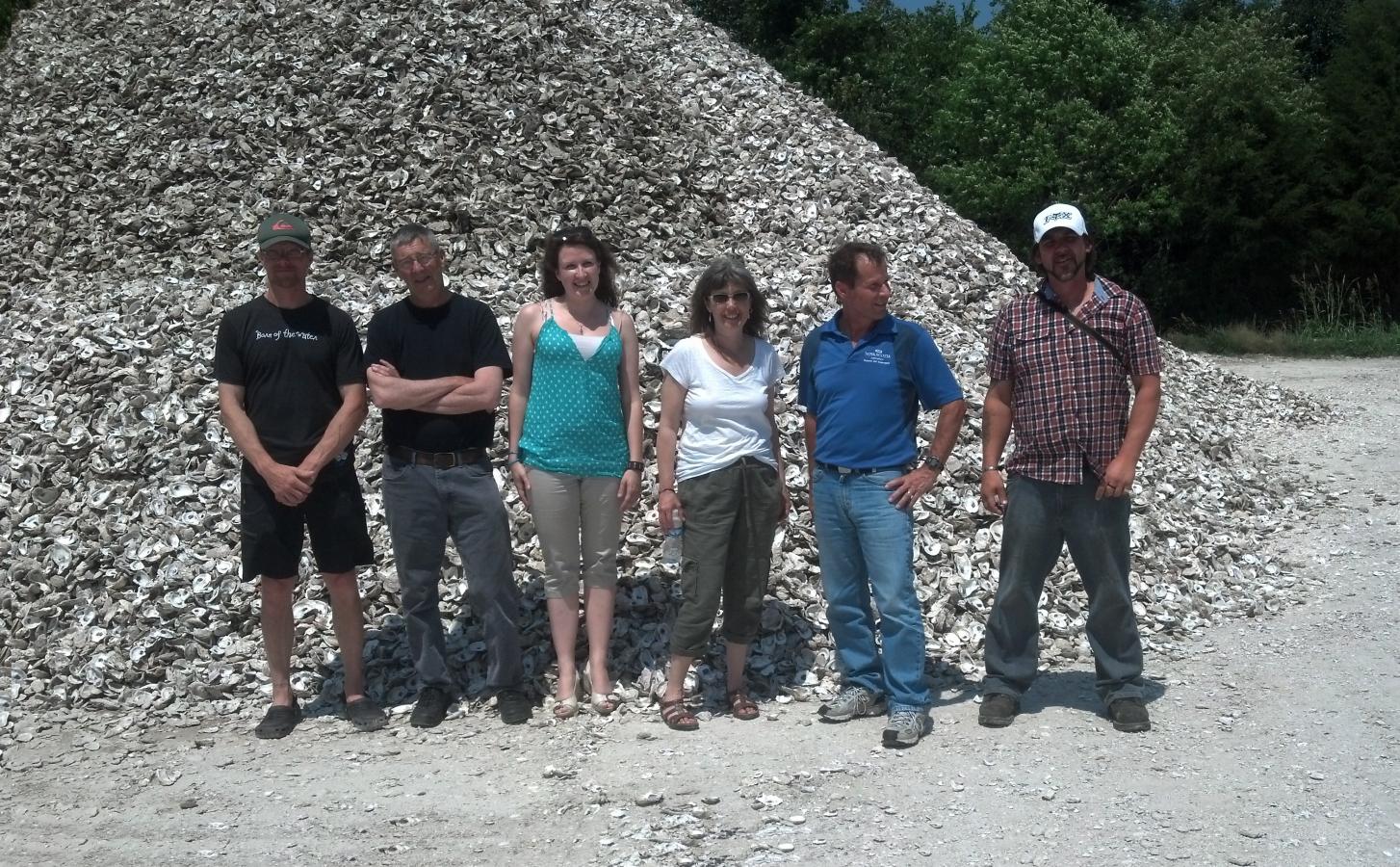 Representatives from the aquaculture industry in Nova Scotia stand in front of a mound of aged oyster shells, which the Horn Point Oyster Hatchery will use to produce spat-on-shell.