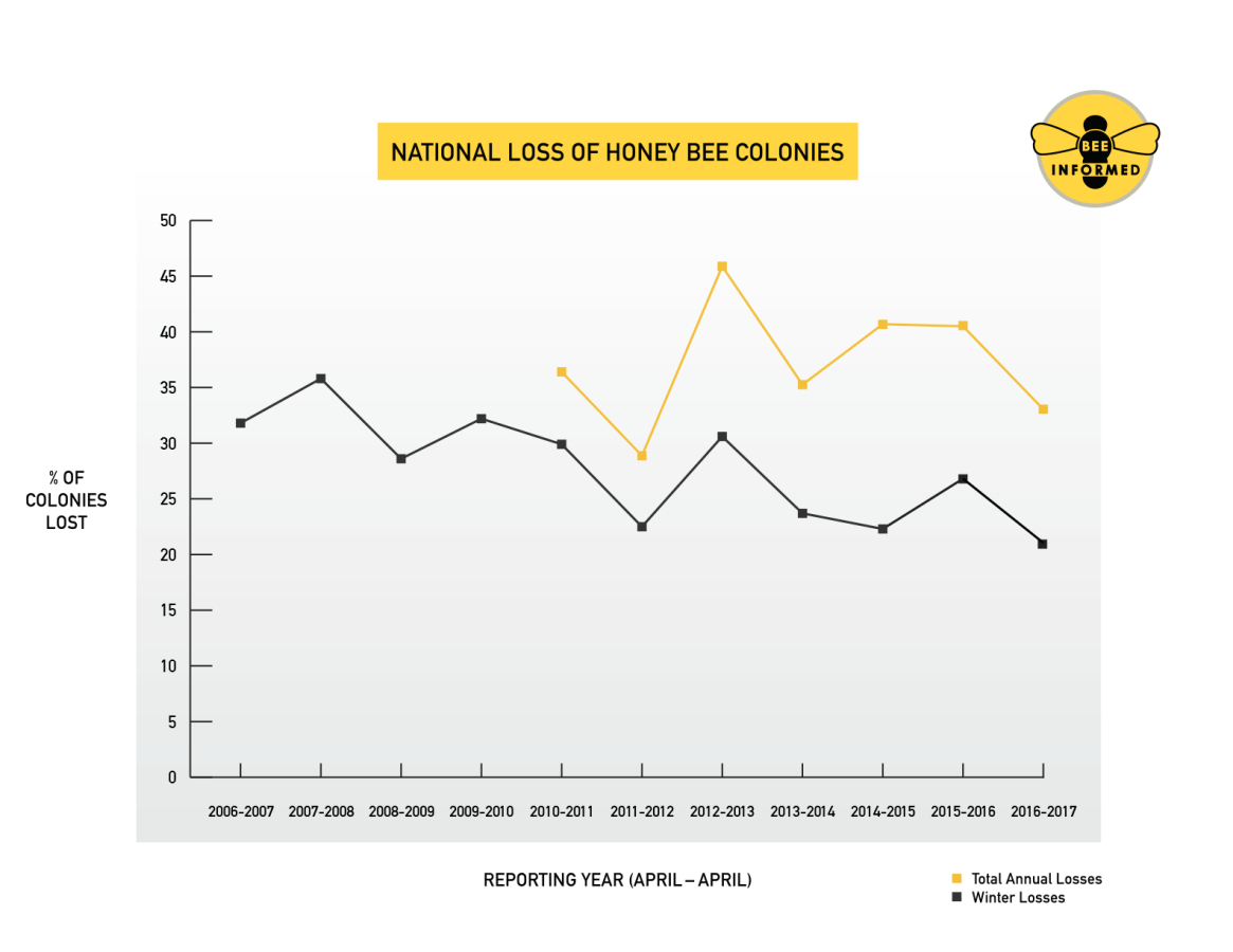 College Park, MD -- Beekeepers across the United States lost 33 percent of their honey bee colonies during the year spanning April 2016 to April 2017, according to the latest preliminary results of an annual nationwide survey. Rates of both winter loss and summer loss—and consequently, total annual losses—improved compared with last year.