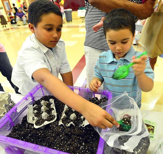 Andon Malott, 8, left, and his brother, Torin Malott, 4, work at planting lettuce seeds at a healthy habits program at Ruth Ann Monroe Primary School in Washington County.