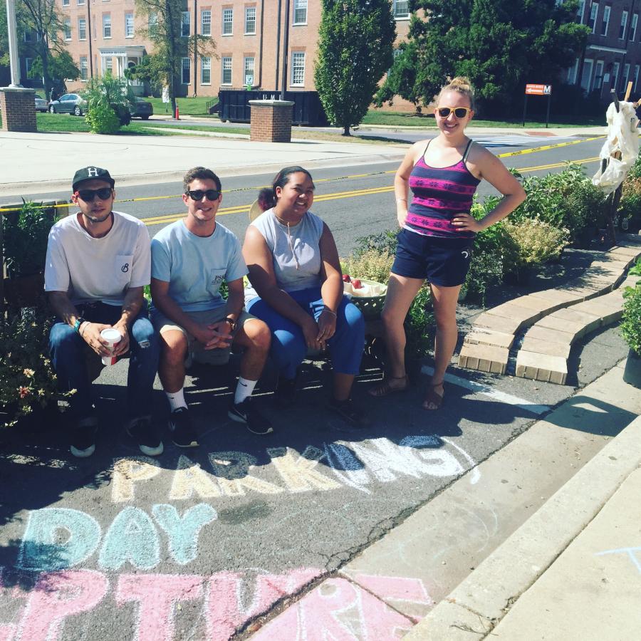 Landscape Architecture and SASLA students pose in front of their renovated parking spaces at this year's (PARK)ing Day