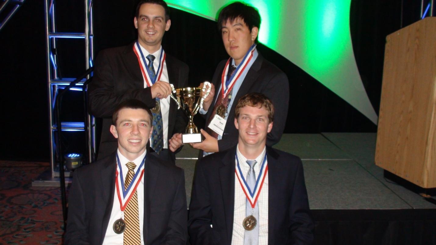 UMD team members pose with their first place trophy. From left to right sitting: Ryan Higgins and Justin Patenaude. Left to right standing: Scott Hosier and Matt Park