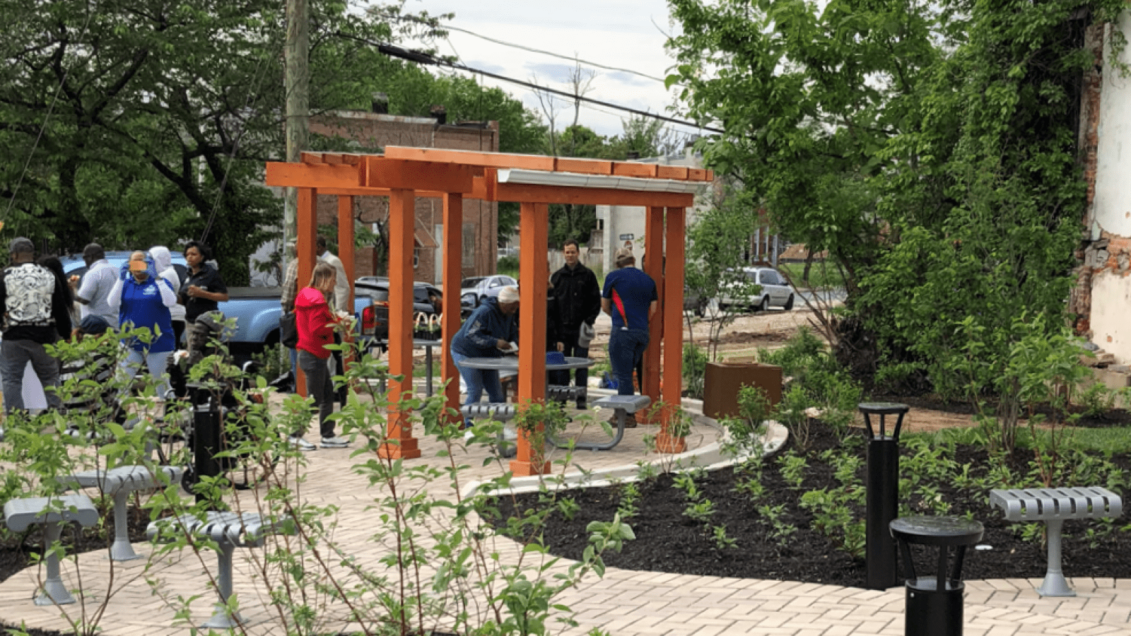 “Revitalizing this corner shows the residents that we can start right here at the top of the neighborhood, the archway of the community, and make some changes that will spread throughout. The residents will defend the space and celebrate the legendary people from historic Druid Heights,” says Anthony Pressley, executive director of the Druid Heights Community Development Corporation (CDC). “We are considering this a signature park for Druid Heights and Baltimore city at large,” continues Johndre Jennings, director of real estate development for the Druid Heights CDC. “This space used to be blight, but we were able to work with Dr. Kweon’s students to create a design that really compliments our vision for the community.”