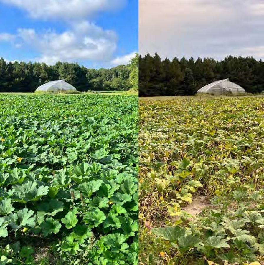 mildew resistant (tolerant) pumpkin variety (Charisma) vs. a similar non-resistant variety (New Rocket, same days to harvest and same wt per pumpkin as Charisma). Calcium silicate was applied at a rate of 4,000 lbs/a before bed formation to 4 rows in a plot (25x50 ft area). Lime was applied to the other 4 rows in a plot to bring soil pH up to 6.8-7.0. Within each split plot a 2x2 experiment was run with the two varieties of pumpkin at two ‘rates’ of Stimplex (applied or not applied). This created a 2x2x2=8 treatment factorial study. There were 8 rows of plastic (2 pumpkin varieties, two rates of silicon (applied or not) and two rates of Stimplex (applied or not)) 50 feet long on 6 ft row middles with drip irrigation. There were 4 reps. Pumpkin seeds were planted 8 June at a 3 ft spacing, 16 plants/row. Stimplex was applied at the rate of 1.5 qts/a via drip irrigation on 22 June, 14 July, 28 July, 18 August and 6 September. Foliar diseases (powdery and downy mildew) were evaluated in late June, and in mid-July, August and September by examining the percentage of leaf area infected by a pathogen. A rating system of 1-5 was used with 1=1-10%; 2=11-25%; 3=26-50%; 4=51-75%; 5= >76% of foliage infected. No fungicides were used in this study. Pumpkins were harvested and weighed on 15 September. Data were analyzed using 2x2x2 factorial ANOVA and means were separated using Orthogonal Contrasts (SAS, 2009). Pumpkin plants can succumb to downy mildew very quickly (fig. 1).