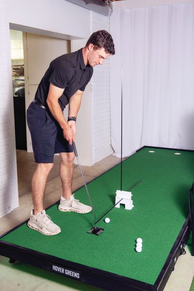 Murnane’s early journey of playing junior golf, tinkering with his swing, and drive to become a better player led to the idea, and now product launch of Hover Greens, an indoor, all-season, long-board putting green system with four electric motors and projection software, allowing the user to adjust the slope and pitch of the green, effectively simulating the four most common slopes (straight, right to left, uphill, downhill) you’ll experience on the course. He originally decided to build Hover Greens to improve his own putting, but once he realized its utility for the golfing masses, he decided to scale production. He built this from the ground up with his self-taught knowledge of coding, carpentry, and agronomy.