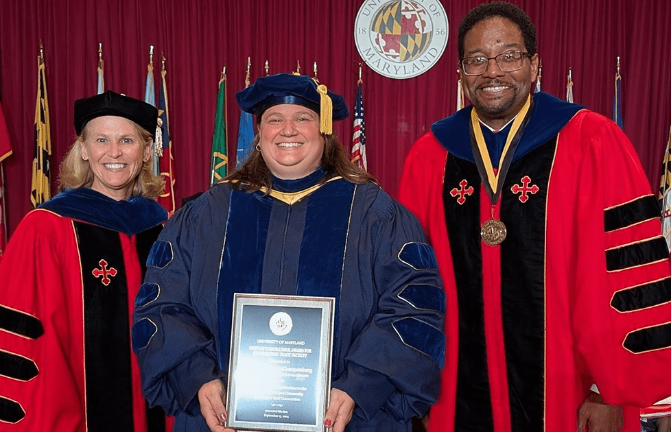 Monica VanKlompenberg, senior lecturer in the Department of Animal and Avian Sciences, received the Provost's Excellence Award for Professional Track Faculty at the university's annual convocation ceremony on September 17, 2025. VanKlompenberg was recognized for her consistently excellent contributions in innovative teaching, having brought about "near-transformational change in many of the department's lower division and core courses," according to her Department Chair, Adele Turzillo, and former chair, Tom Porter.