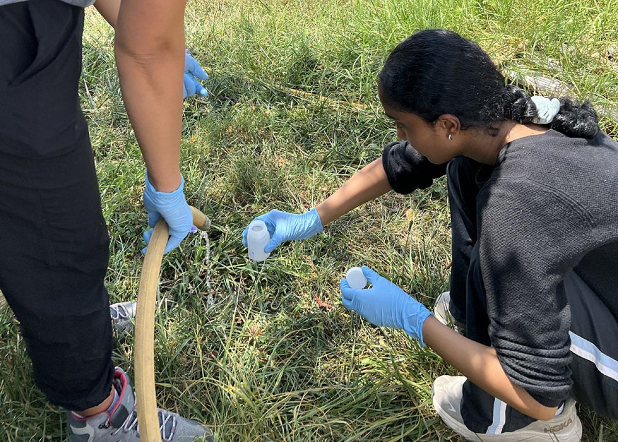 UMD graduate assistant Fatemeh Ghezelsofla (Left) and high school senior intern Tanvi Modugula collect water samples on an organic farm.