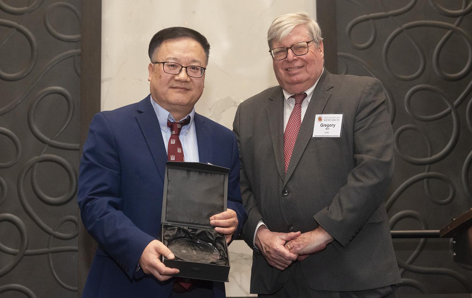 Professor Xiaoping Zhu displays his award with Vice President for Research Gregory F. Ball