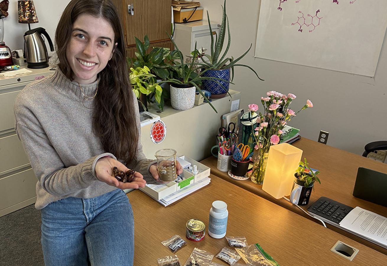 Helen McSherry Craig displays a handfull of edible beetles and a beaker of cricket powder.